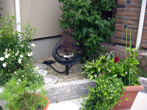 休日にお二人でガーデニングをされるという事で、お庭に出るのが楽しみになるようなグリーンいっぱいのお庭を造りました。ワンダーデコールの置物やアイアンを配置し甘くなり過ぎないに配慮しています。